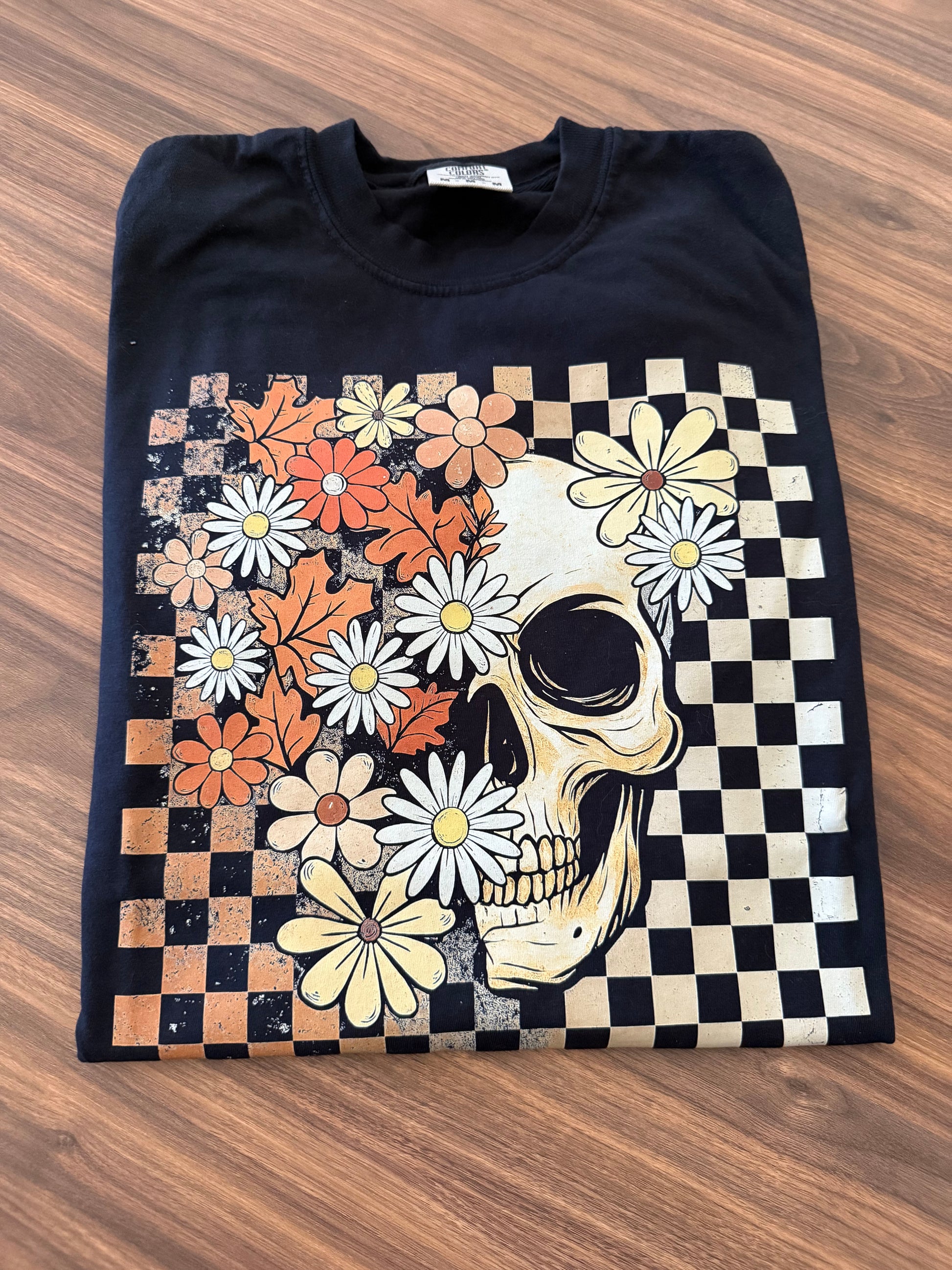 Celebrate fall with a playful twist in this boxy tee featuring a checkered skull adorned with vibrant flowers. Perfect for Halloween or cozy autumn days, its relaxed fit keeps you comfortable while showing off your unique style. Embrace the season’s spooky charm with a fun floral edge!